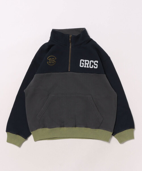柔らかな裏毛素材を使用したハーフジップスウェット。落ち着いた色目で組み合わせたクレイジー配色が特徴。サイズ感は、ややゆとりのあるGROOVY定番型。右胸はGとCとSを組み合わせたワンポイント刺繍。左胸はロゴプリント。■素材30/-の柔らかな裏毛素材。■仕様ポケットあり