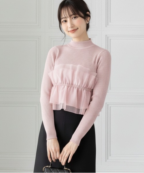 シャーリングデザインで華やか見え!オーガンジードッキングリブニットトップス 【デザイン】 ハイネックニットにシャーリングデザインの布地をドッキングした個性派トップスです。 胸元の立体感あるデザインが、コーデのアクセントになります。 1枚でレイヤード風のスタイリングが完成する便利なアイテムです。 【素材感】 着心地の軽いポリエステル素材 伸縮性:あり/ 透け感:IVのみ若干あり/ 裏地:なし 水洗いによる洗濯不可 / ドライクリーニング可 【コーディネート】 ミニスカートと合わせれば、甘さの中に大人っぽさが香るガーリースタイルになっておすすめです♪ タイトスカートとの組み合わせも◎ 落ち着いた雰囲気で着こなせます。 ワイドパンツに合わせれば、すっきりとしたバランスのクールなコーデが完成します! 【※お取り扱い上のご注意】 1:モニター環境等により実際の商品と多少色味が異なって表示される場合がございます。予めご了承下さい。 2:屋外で撮影された商品は、天候により多少実際のカラーと異なる場合があります。商品のカラーはトルソー(マネキン)の商品画像をご参照ください。 3:濃い色の商品は、お洗濯や摩擦等による移染にご注意ください。 4:末永くご愛用頂く為に、アテンションタグ・洗濯ネームを必ずご確認の上、着用又はお取り扱い下さい。 5:生産時期により、色、サイズ、デザイン、素材の質感が多少が異なる場合がございます。あらかじめ御了承下さいませ。