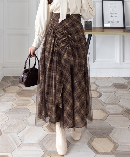 主役級の存在感!シャーリング切替アシンメトリーチュールスカート【デザイン】シャーリングとチュールの切り替えで立体感を出したアシンメトリーデザインのスカートです。動くたびに揺れる軽やかなチュールがフェミニンさをプラスし、チェック柄との組み合わせで大人可愛い雰囲気に仕上げています。裾のアシンメトリーなラインがコーデにアクセントを加え、存在感のある一枚です。【素材感】着心地の軽いポリエステル素材伸縮性:なし/ 透け感:あり/ 裏地:あり/ウエストゴム:バックのみあり 手洗いによる洗濯可 / ドライ・ウェットクリーニング可【コーディネート】シンプルなトップスを合わせるだけで主役級のスタイルが完成します。ショート丈トップスを合わせてウエストを強調すればスタイルアップ効果も抜群。足元はブーツでモードにまとめたり、パンプスで女性らしく仕上げるのもおすすめです。【CLEAR BASIC】2025年春から、OL層のお客様向けの着回ししやすい新ブランドです♪【※お取り扱い上のご注意】1:モニター環境等により実際の商品と多少色味が異なって表示される場合がございます。予めご了承下さい。2:屋外で撮影された商品は、天候により多少実際のカラーと異なる場合があります。商品のカラーはトルソー(マネキン)の商品画像をご参照ください。3:濃い色の商品は、お洗濯や摩擦等による移染にご注意ください。4:末永くご愛用頂く為に、アテンションタグ・洗濯ネームを必ずご確認の上、着用又はお取り扱い下さい。5:生産時期により、色、サイズ、デザイン、素材の質感が多少が異なる場合がございます。あらかじめ御了承下さいませ。