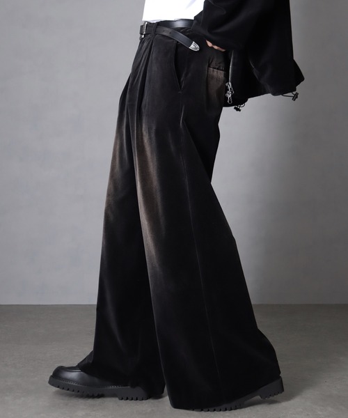 【welise】2025 Autumn/Winter-more Elegance-ベルベット素材本来の”美しさ”に加工感が織りなす今っぽい”ヴィンテージ感”を乗せたワイドフレアパンツ。◆デザイン◆今秋冬の新素材としてweliseが提案する【ヴィンテージベルベット】を使った唯一無二の新型スラックスが登場。独特の色落ち・アタリ感が特徴的なケミカルオーバーダイを施した、着古されたようなヴィンテージ感を楽しめる加工を施しています。加工により生まれた表情が、シンプルなパンツとは一線を画す一本が完成しました。センタープレスをしっかりと入れることで、縦に長くみせるスタイルアップ効果も。◆素材◆見た目にも高級感溢れるベロア(ベルベット)素材を生地から生産。加工により絶妙な柔らかさを出して、非常に着心地よく仕上がっています。ヘビーウェイト~ミドルウェイトの中間くらいで程よい肉感に。ロングシーズンの着こなしに対応しています。コットン100%の天然繊維なので肌当たりもよく、使い込むごとに馴染んでいくのもポイントです。手に取りやすいコストパフォーマンスも魅力です。◆シルエット◆大きくとったワタリからストンと落としたゆったりめなワイドバギーシルエット。さらに裾幅を広くとり、やりすぎない程度のフレアしたラインに。※Attention※・縫製後にオーバーダイ加工を施しております。染色の特性上、多少のシワや形の変化やサイズのブレが生じ、1着ごとに色合いや風合いなどが異なる仕上がりになっています。また生産時期によって、若干色のブレが生じる可能性がございます。・着用の摩擦により、淡色の衣類やベルト、バッグなどへ色移りが起こる可能性がございます。・洗濯の際、濃色品は色落ちしたり他の衣類へ色移りすることがあります。淡色の衣類と分けてください。また多少の伸び縮みやよじれが生じることがあります。-welise/ウェライズ-ブランド名はwell(良い)+Rise(上昇)を組み合わせた造語になります。洋服の持つ本来の美しさを最大限に引き出したハイエンドな素材感にこだわりながら常にアップデートしていくシルエット・デザイン性も追求。※撮影場所やライティング、お使いのモニター環境によって色の見え方が異なる場合がございます。