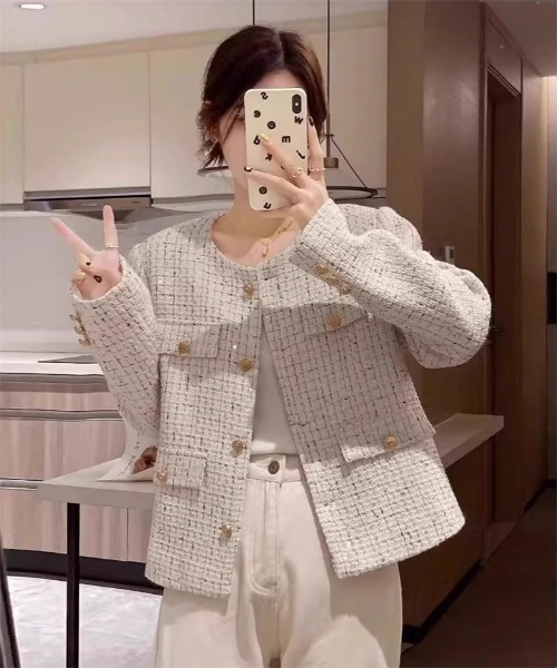 ゴールドボタン ノーカラーツィードジャケット登場♪ 今年トレンドのゴールボタンがアクセントのノーカラージャケットです♪ 普段使いやちょっとしたお出かけの日にも幅広く活躍間違いなしな一枚。 丁度よい丈感なのでスキニーデニムやワイドパンツ、スカートなどボトムを選ばないコーデが楽しめるアイテム♪ ※店頭及び屋外での撮影画像は、光の当たり具合で色味が違って見える場合があります。またご覧いただきますモニターや使用環境により実際の商品と多少色味が異なって表示される場合がございます。 予めご了承をお願いいたします。 ★商品のお気に入り登録→【カートに入れる】右側の♡をクリック 完売カラーの再入荷通知や、ラスト1点の通知、セールの通知も受け取ることができます。 ★ブランドのお気に入り登録→ブランドタグのページからお気に入りをクリック 新作商品や再入荷などブランドのお得な情報を受け取ることができます。 ※ご注文いただいた予約商品のお届け時期の確認は、注文履歴ページより行えます。 ※他のキャンペーンにより、期間中に価格が変動する場合がございます。 ※セールは予告なく終了させていただく場合がございます。