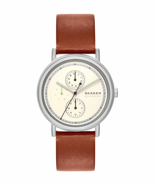 シルバートーンのステンレススチール製ケースとサンドブラスト仕上げのクリームダイヤルに、マルチファンクションサブダイヤルとしなやかなブラウンレザーストラップを組み合わせ、すっきりとしたミニマルな美しさを表現しています。コレクション名:Signaturケースサイズ:40 MMラグ幅:20 MM防水: 5気圧ムーブメント:クォーツ/マルチ表示:アナログ輸入: 正規品保証:2年間【 SKAGEN について 】1989年に創業したSKAGEN(スカーゲン)は、これまでデンマークのデザインやライフスタイルにインスパイアされた商品を展開してきました。とくに、デンマークの自然豊かな景色や街並み、「HYGGE(ヒュッゲ)」という、居心地の良い暮らしや家族や友人との時間を大切にする習慣など、SKAGENのモノづくりにおいてはそれらがいつもインスピレーションの源となっています。< クオーツ製品の電池について >お買い上げ時に時計にセットされている電池は、動作確認用のモニター電池です。出荷前の保管期間中にも電池は消耗しており、ご購入時点で電池が切れている場合がございます。なお、電池切れは保証の対象外となりますので、あらかじめご了承ください。< ご確認ください >※パッケージは実際の画像と異なる場合がございます。※外箱には、輸送時にキズや凹みが生じる場合がございます。あらかじめご了承ください。※ご利用のモニター環境や照明の影響により、実際の商品と色味が異なって見える場合がございます。※納品書は保証書の代わりとなりますので、大切に保管していただきますようお願いいたします。※商品タグに記載している価格につきまして、旧価格のものが混在している場合がございます。それにより、商品に表示されている価格と異なるタグが付いている場合がございますが、正しい販売価格はご注文時に画面に表示された価格となります。ご了承下さいますよう、お願い申し上げます。