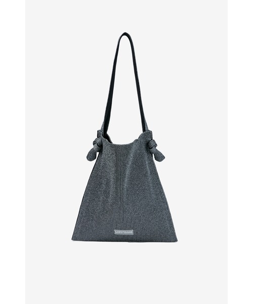 京都の伝統文化として栄えてきた金銀糸を元に、最先端技術により開発されたラメ糸を使用。日本国内に数台しかない特殊な編み機を使用。張り感のある素材でありながらも軽く、縦には伸びにくいが横への伸縮性は十分にあり、見た目以上の収納力と使いやすさが特徴。ショルダーの結び目を解いてリバーシブルでの使用も可能。