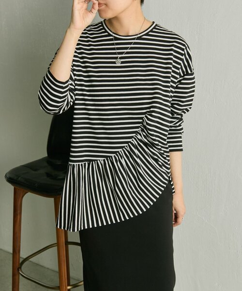 さり気なく個性的!ボーダー×フリルデザイントップス■デザイン・着心地・フロント裾部分の大胆なフリルデザインがポイント・さり気なく個性的なデザイン・シンプルボトムスと合わせるだけでもお洒落見え・ヒップをカバーしてくれる丈感・厚手過ぎない素材感でロングシーズン着用可・上身頃や袖などはベーシックなシルエットなのでインナーとしても使える■サイズ追記・着丈:70cm・裄丈:78cm・袖口巾:10.5cm・アームホール:43cm《スタッフ着用コメント》(身長160㎝/普段着用サイズ:Mサイズ/骨格ウェーブ)ヒップの終わりよりやや下にくるくらいの長さ。袖は腕を下に降ろした際に手の甲が半分ほど隠れるくらいの丈感。 柔らかい綿素材で肌触り良く着心地◎■スタイリングシンプルなワンカラーのスラックスやタイトスカート合わせがおすすめ。上からベストを合わせたりVネックトップスのインナーとして着るのも◎■素材感素材:綿100%洗濯表示:手洗い可・・・・・・・・・・・・・・・・・・・・・・透け感:なし裏地:なし伸縮性:あり光沢感:なし生地の厚さ:やや薄手・・・・・・・・・・・・・・・・・・・・・・【SUM1 STYLE(スミ スタイル)】とは…ear PAPILLONNERのアパレル、グッズを展開するインブランド。 コンセプト▼メンズライクの中より溢れ出る女性らしさ動きのある大人の新しいニューカジュアル自らファッションを創り出す人々に提案SUM:統合 1枚で決まる洗練されたスタイルSUM:総和 生地と生地、柄と柄、無限の組み合わせの答えSUM:和 人と人、洋服 SUM:要点 デザインを明確に伝えるインパクト