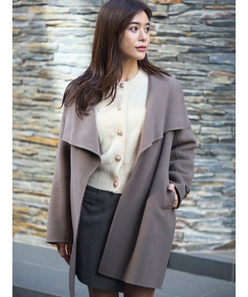 顔まわりを華やかに演出するビッグカラーが印象的なリバーミディコート。素材にはイタリア・BELLANDI社のインポート生地を使用。濡らした状態で起毛をかけることにより毛並みの美しさと光沢をプラス。Super130’sのファインウールにカシミヤをブレンドした原料を使用した薄手の二重織素材です。ふくらみ感がありながらも軽く、柔らかくしなやかな風合いが特徴です。保温性にも優れ、秋冬シーズンを快適に過ごせます。ヒップ下の今年らしいミディ丈で、パンツにもスカートにも合わせやすいバランス感が魅力。共布ベルトでウエストをマークすれば女性らしいメリハリのある着こなしに。羽織るだけでもサマになり、オンオフ問わず長く活躍する一枚です。
