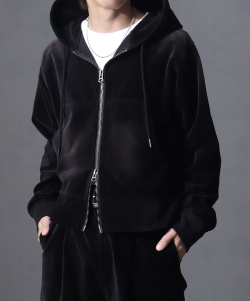【welise】2026 SpringSummer -Intuition Sense-ベルベット素材本来の”美しさ”に加工感が織りなす今っぽい”ヴィンテージ感”を乗せたジップアップパーカー。◆デザイン◆新素材としてweliseが提案する【ヴィンテージベルベット】を使った唯一無二の新型フーディーが登場。独特の色落ち・アタリ感が特徴的なケミカルオーバーダイを施した、着古されたようなヴィンテージ感を楽しめる加工を施しています。ショート丈によるボクシーなシルエットも魅力的で、さりげなくスタイルアップしてくれます。フード部分を2重仕立てにすることで、立ちを良く改良しており、どの角度から見ても抜群のシルエットに。アウターライクなゴツめのダブルジッパー使いや絶妙なサイズボリュームのあるフードなど、羽織るだけでさまになるアイテムです。◆素材◆見た目にも高級感溢れるベロア(ベルベット)素材を生地から生産。加工により絶妙な柔らかさを出して、非常に着心地よく仕上がっています。ヘビーウェイト~ミドルウェイトの中間くらいで程よい肉感に。ロングシーズンの着こなしに対応しています。コットン100%の天然繊維なので肌当たりもよく、使い込むごとに馴染んでいくのもポイントです。手に取りやすいコストパフォーマンスも魅力です。◆シルエット◆weliseで定番化されつつあるショート丈を採用。従来のオーバーサイズに比べるとややコンパクトながら、適度なゆとりは持たせております。サイズ問わずインナーに合わせるアイテムを選ぶことなく、ストレスフリーな着用感も嬉しい。前を閉めたメイントップス使いから、サラッと羽織ったライトアウターとして、またジャケットやコートなどのインナーにも使える抜群の着回し力も魅力的です。※Attention※※撮影場所やライティング、お使いのモニター環境によって色の見え方が異なる場合がございます。・縫製後にオーバーダイ加工を施しております。染色の特性上、多少のシワや形の変化やサイズのブレが生じ、1着ごとに色合いや風合いなどが異なる仕上がりになっています。また生産時期によって、若干色のブレが生じる可能性がございます。・着用の摩擦により、淡色の衣類やベルト、バッグなどへ色移りが起こる可能性がございます。・洗濯の際、濃色品は色落ちしたり他の衣類へ色移りすることがあります。淡色の衣類と分けてください。また多少の伸び縮みやよじれが生じることがあります。-welise/ウェライズ-ブランド名はwell(良い)+Rise(上昇)を組み合わせた造語になります。洋服の持つ本来の美しさを最大限に引き出したハイエンドな素材感にこだわりながら常にアップデートしていくシルエット・デザイン性も追求。
