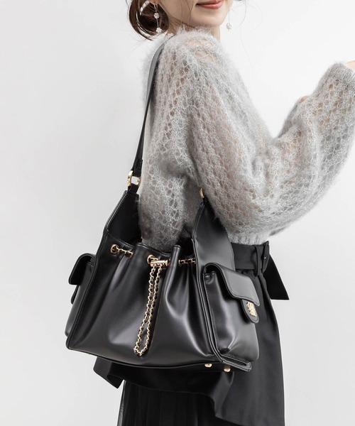 ◆2025AW新商品◆上品なチェーンデザインのドローストリングバッグ。エレガントながら程よくエッジの効いたデザインが、コーディネートにアクセントを添えてくれるアイテムです。POINT・エレガントなチェーンデザイン・アクセントになるサイドポケットのモノグラム金具・ブラックは滑らかなスムース素材、アイボリーは女性らしいツイード素材・太めのショルダーが肩の負担を軽減商品仕様・外側フラップポケットx2・内側オープンポケットx2・底鋲あり【サイズ感】長財布:〇、ペットボトル(500ml):〇、スマートフォン(14.7×7.2㎝):〇、ポーチ:〇、カードケース:〇、ハンカチ:〇、リップ:〇、ワイヤレスイヤホン:〇、クリーム:〇、A5手帳:〇