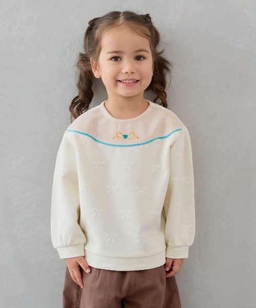 カーディガン(M253GDB06P)と同じ立体感のあるリボン柄がちりばめられたジャカード織りのベージュとミントカラーで首元にポイントを与えたモイモルンらしいデザインの長袖トップス。背中にはボタン付きで脱着も簡単。胸部分のリボン刺繍のポイントで愛らしさをプラスし、すっきりとしたアイボリーカラーが色々なアイテムとコーディネートをしやすいさせてくれます。洗濯方法:手洗い(水に長時間つけ置かないでください)※moimolnの服は少し小さめのつくりになりますので、国内メーカーで普段着用サイズの1サイズ上を推奨しておりますが、デザインによる違いや個人差がございます。韓国子供服で人気のブランド「moimolnモイモルン」moimoln(モイモルン)とは?北ヨーロッパ・スカンジナビア半島のライフスタイルからインスピレーションを受け、シンプルかつおしゃれで実用的、自然との調和を大切にした「Unique Scandistyle Brand」です。今までに出会ったことのない新しい感性で、幸せを願うママと愛しいお子様のためにつくられました。■サイズ目安※当ブランドは韓国企画の為、日本企画の商品とサイズ感が若干異なります。こちらのサイズ換算は日本企画のサイズに置き換えた際の一般的な目安サイズになりますので、ZOZOTOWNのサイズスペックも合わせてご参照の上、ご検討をお願い致します。【90】身長:約73-83センチ, 10-18ヶ月相当【100】身長:約83-87センチ, 18-24ヶ月相当【110】身長:約87-93センチ, 約2-3歳相当【120】身長:約94-105センチ, 約3-4歳相当【130】身長:約105-115センチ, 約4-5歳相当※対象月齢について:韓国での対象身長に対する年齢の目安となりますのであらかじめご了承ください。まずは【お気に入りショップ追加】を。商品の情報がお届けしやすくなりました♪