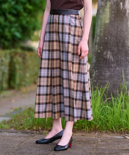 《毎年大人気のスカートが今年も登場!クラシカルなチェック柄が秋冬のスタイリングに映えるソフトタックスカート》●ドレステリアオリジナルのチェック柄●スタイリングのアクセントになるレザー調のウエストベルト●腰位置が高く見えるすっきりしたシルエット●こだわりドレステリアオリジナルチェックのスカート。チェックの配色にこだわり、何十パターンもの配色を組みました。糸の染色にもこだわり、落ち着いた中にも華を感じさせるスカートです。ウエストベルトの合成皮革とのコンビネーションが秋らしく、着映えするデザイン。ウエストからヒップにかけてすっきり見えるようデザインしているので、タックフレアでも甘くならず、スタイリッシュな印象です。太めにとったウエストベルトとハイウエストデザインで腰位置が高く見え、身体のラインを拾わず細く見せてくれます。細身のニットをインするスタイリングがおすすめ。ウエスト周りがすっきりとしているので、トップスをアウトして着用しても、もたつかずにキレイに着用いただけます。●素材ポリエステルウールの糸を綾織物であるビエラ組織で織り上げたドレステリアオリジナルのチェック。程よいハリがあり、軽くシワにもなりにくい素材です。※照明の関係により、実際よりも色味が違って見える場合があります。また、パソコン・スマートフォンなどの環境により、若干製品と画像のカラーが異なる場合もございます。店舗へのお問い合わせ商品番号:085-74010●製品寸法:34(SS):W67cm H95cm 総丈85cm36(S):W70cm H98cm 総丈86cm38(M):W73cm H101cm 総丈87cm40(L):W76cm H104cm 総丈88cm備考: