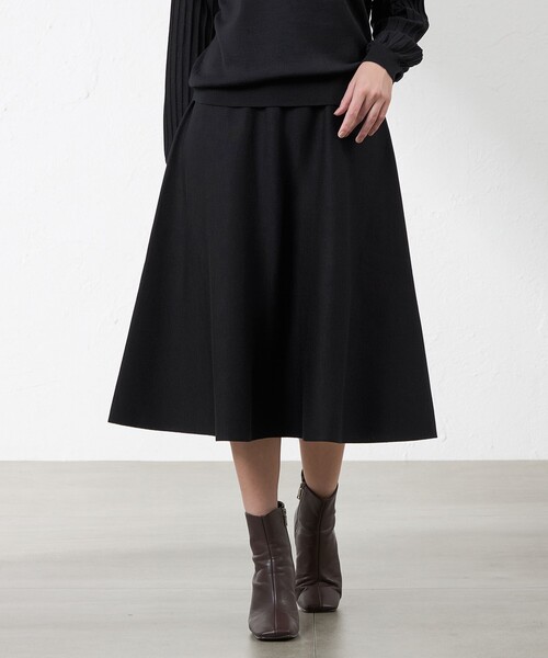 大人に似合うキレイ目シルエットのニットスカート【デザイン】セットアップで着用できる、ミラノリブのフレアラインがきれいなニットスカートです。ウエストはストレスフリーなゴム仕様で楽に着用いただけます。ミラノリブリボンタイニット(V5N09623)とセットアップでのコーディネートもおすすめです。【素材】ソフトで優しい風合いの再生繊維(セルロース)に伸縮性のあるポリエステルを撚糸した、軽量感とドレープ性が特長です。適度なストレッチ性があり、目面のきれいな素材です。手洗い可能でお手入れしていただきやすいです。
