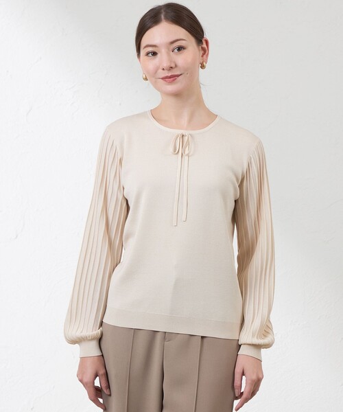 1枚で着映えするリボンタイニット【デザイン】ガーター編みのパフ袖がポイントのゴム地のプルオーバーです。襟元に縫い留まった共糸リボンを結ぶデザインです。裾はリブですっきりさせた、一枚で着映えするデザインです。カラー展開はオフとネイビー、ダークブラウンの3色展開です。光電子ミラノリブジャケット(V5E08622)やミラノリブスカート(V5S10623)とのコーディネートも統一感があり、おすすめです。【素材】ソフトで優しい風合いの再生繊維(セルロース)に伸縮性のあるポリエステルを撚糸した、軽量感とドレープ性が特長です。適度なストレッチ性があり、目面のきれいな素材です。手洗い可能でお手入れしていただきやすいです。