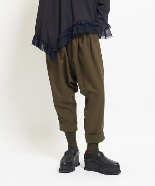 2025-26 AUTUMN/WINTER COLLECTION■design・リラックス感とデザイン性を兼ね備えた、存在感のあるサルエルパンツ。・ウエストは前開き仕様に加えゴムが入っており、快適なフィット感と着脱のしやすさを両立。・フロントには深めのタックが施され、腰回りにゆとりを持たせつつ立体感のあるシルエットに。・股上を大きく落としたサルエルデザインは、動きやすさと独特のモード感を演出。・裾はダブル仕立てで、足元に程よい重みを加えてバランスの良いラインに。■fabric・ソフトなふくらみとしなやかさを兼ね備え、暖かみのあるテキスタイル。・適度に伸びがあり、シワになりにくいことが特徴。■coordinate・ゆったりとしたロングカーディガンやオーバーサイズのシャツを羽織り、リラックス感のある着こなし。・厚底のブーツやサンダルを合わせるとアバンギャルドな印象に。 ‥‥‥‥‥‥‥‥‥‥‥‥‥‥‥‥厚さ:普通透け感:なし伸縮性:あり光沢感:なしポケット:あり裏地:なし※詳しいお手入れ方法は商品タグをご参照ください。‥‥‥‥‥‥‥‥‥‥‥‥‥‥‥‥《お知らせ》・商品画像はご覧のモニター環境により、実物の色味と多少異なる場合がございます。予めご了承ください。・「商品のお気に入り登録」で再入荷・値下げ・在庫1点などの通知を受け取ることができます。・「ブランドのお気に入り登録」で新商品や再入荷など、お得な情報を受け取ることができます。※他のキャンペーンにより、期間中に価格が変動する場合があります。※セールは予告なく終了させて頂く場合もあります。