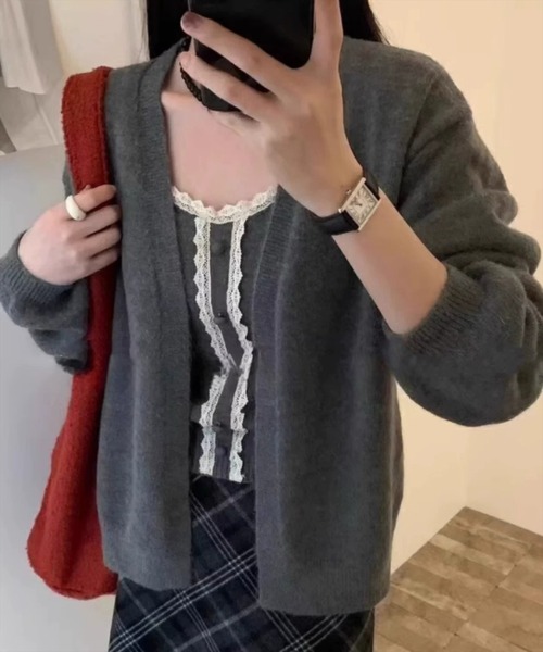 女の子らしさを引き立てる上品なコンビネーション!ニットカーディガン+レースキャミアンサンブル【デザイン】ベーシックなニットカーディガンとレース使いのキャミソールがセットになったアンサンブルです。カーディガンはコンパクトなシルエットで羽織りやすくキャミソールは華やかなディテールでレイヤードスタイルを引き立てます。組み合わせても単品でも使える着回し力の高いセットアイテムです♪【素材感】着心地が柔らかいアクリル素材伸縮性:あり/ 透け感:若干あり/ 裏地:なし 手洗いによる洗濯可 / ドライ・ウェットクリーニング可【コーディネート】カーディガンを羽織ってきちんと感のあるスタイルにしたりキャミソールをメインにして女性らしいヘルシーなコーデを楽しんだりとその日の気分でアレンジが可能です♪デニムと合わせればカジュアルにフレアスカートを合わせればガーリーな雰囲気に仕上がります!【※お取り扱い上のご注意】1:モニター環境等により実際の商品と多少色味が異なって表示される場合がございます。予めご了承下さい。2:屋外で撮影された商品は、天候により多少実際のカラーと異なる場合があります。商品のカラーはトルソー(マネキン)の商品画像をご参照ください。3:濃い色の商品は、お洗濯や摩擦等による移染にご注意ください。4:末永くご愛用頂く為に、アテンションタグ・洗濯ネームを必ずご確認の上、着用又はお取り扱い下さい。5:生産時期により、色、サイズ、デザイン、素材の質感が多少が異なる場合がございます。あらかじめ御了承下さいませ。