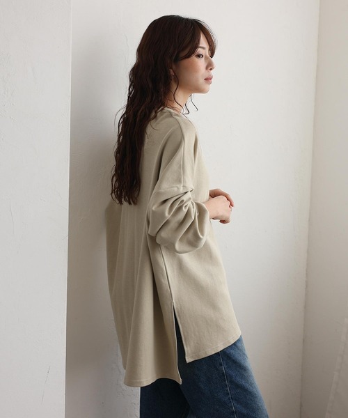 【デザイン】 オーバーサイズ プルオーバー 深めスリット入りロンT ゆったりとしたシルエットで体型カバーにも活躍する、オーバーサイズプルオーバー。 伸縮性のある柔らかなカットソー素材を使用し、ストレスフリーな着心地を実現しました。 両サイドに施された深めのスリットが抜け感をプラスし、 シンプルながらもこなれたスタイルを演出。 カジュアルからきれいめまで幅広く合わせやすく、パンツやスカートとも好相性。 オーバーサイズ感を活かしたレイヤードコーデもおすすめで、 季節を問わずデイリーに活躍する万能トップスです。 【サイズ等】 サイズ:FREE 総丈:前74cm後79cm 肩幅:72cm 身幅:69cm 袖丈:51cm 袖口幅:10cm 重量:315g 素材:綿100% …………………… 伸縮性:あり 裏地:なし 透け感:オフホワイト若干あり/その他カラーなし 生地の厚さ:普通 ポケット:なし …………………… 【お取り扱い上の御注意】 繊維および染料の性質上、汗や水で濡れますと色落ちすることがあります。 長時間の水などの浸漬や浸け置き洗いは、縮みや色落ちの原因となりますのでお避けください。 洗濯の際は他の物と分けて洗ってください。 洗濯後は直ちに軽く脱水し形を整えすばやく干してください。 家庭洗濯時のタンブル乾燥はお避けください。 濡れた状態で他の物との擦れによる色移りにご注意ください。 洗濯ネットをご使用下さい。 [カラー] チャコールグレー・グレーベージュ・オフホワイト 着用モデル身長:164cm/着用サイズ:FREE ◆商品のお気に入り登録◆ 完売カラーの再入荷通知や、ラスト1点の通知、 セールの通知も受け取ることができますので、是非ご登録ください。 ◆ブランドのお気に入り登録◆ 新商品や再入荷などの情報を受け取ることができますので、是非ご登録ください。