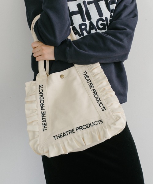 ■デザインポイント・大人可愛いフリルキャンバストートバッグ ・THEATRE PRODUCTS刺繍ロゴが目を引く ・リップやイヤホンなどの小物が入る内ポケット付き ・マチをしっかりとっており、500mlペットボトル/A4サイズ/PCも収納可能 ・開口部が大きく開くので物の出し入れもスムーズ ■カラー展開 アイボリー ブラック ■サイズ展開 フリー ■THEATRE PRODUCTS(シアタープロダクツ) 「洋服があれば世界は劇場になる」をコンセプトに2001年設立。エレガントで女性らしいウエアと、ユーモアとウィットに富んだアクセサリーなどをとおして、ファッションブランドにおきるすべての出来事を舞台にあげてスポットライトを当てる。 デザイナーを武内昭と森田美和が務める。