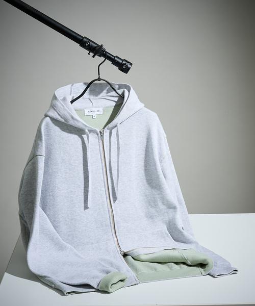 柔らかく、肌に心地よく馴染むZIPパーカーハイゲージ編みが生む上品な表情と、こなれたカラーリングが映える一着。リラックスした着心地とダブルジップで広がる着こなし。秋・冬・春と3シーズンで活躍するシーズンレスな糸使いでワードローブに溶け込みます。【素材】14ゲージで編み上げたコットンベースの接結素材。表と裏で色目を変えたオリジナルカラーです。もっちりとしたハリ感とコットンの柔らかさが両立した着心地の良い一着。【デザイン】表裏の配色がキャッチーなZIPパーカー。腕回り・脇線は特殊な縫製で裏色を表に出しアクセントに。ディテールはクラシックなスウェットフーディーを採用しています。袖は少したるみが生まれるような丸みのあるフォルム。裾に向かってストンと落ちるナチュラルなシルエットです。ダブルZIPのフロントは開けること裏の色が顔を出し、こなれ感を演出します。【コーディネート】リラックスした雰囲気から、きれい目カジュアル、トレンドのAラインシルエットなど,合わせるアイテムを選ばないベーシックなサイズ設定。羽織としてはもちろん、アウターのインナーとしても活躍。同素材のクルーネックと合わせた(品番:00510040004)アンサンブルな着こなしも可能です。