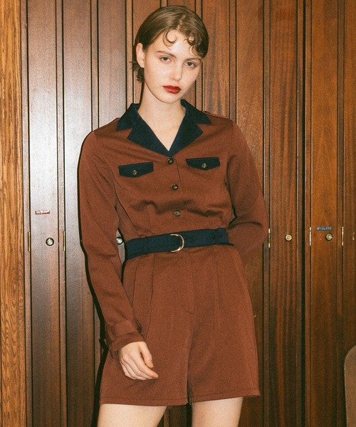 1枚で即サマになる映えオールインワン 落ち着いた配色が大人ムードを引き立てるバイカラーデザインのロンパース。胸元のワークポケットやメタルバックルベルト、トレンドのハンサム襟がアクセントになり、REDYAZELらしいカジュアル感とモード感を兼ね備えた1枚。若干ゆったりとしたサイジングにウエストベルトでシルエット調整ができるため、体型問わずフィットしやすく、着心地も抜群。高見えするしっかりとした素材感と抜け感のあるショートパンツ丈で、ロングブーツを合わせたクールな秋コーデはもちろん、ソックス+ローファーでプレッピーに、ファー小物でフェミニンに振るなど幅広い着こなしが楽しめます。きれいめにもカジュアルにも対応できる万能デザインで、秋冬のおしゃれをアップデートしたい方にぴったりのおすすめアイテムです。 透け感:なし 裏地:パンツ部分のみあり 伸縮性:ない 生地の厚さ:普通 S:S(01):着丈82.5cm 身幅47cm 肩幅37cm 袖丈61.5cm ウエスト72cm M:M(02):着丈84.5cm 身幅48.5cm 肩幅38cm 袖丈62.5cm ウエスト75cm