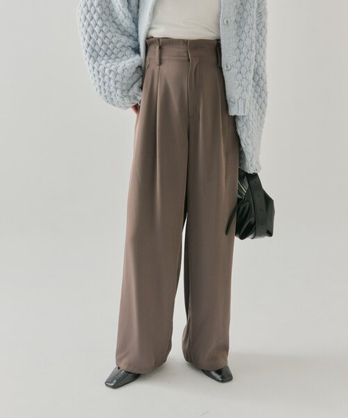 シンプルで使いやすい◎光沢感のある美シルエットパンツが登場!●デザイン・程よいワイドと落ち感のあるシルエットで脚のラインを拾わず脚を綺麗に魅せてくれる美シルエットパンツ。・タック仕様なので気になる腰回りもカバーでき、光沢感のある生地でさらっとした履きやすいのもポイントです◎・ウエスト部分はフリルっぽいタックでインしても決まります◎後ろのポケットも大きめに作られているのでヒップラインをカバーできます。・2サイズ展開でピッタリのサイズをお選びいただけます。●スタイリング・どんなトップスとも合わせやすい万能なパンツです◎・ゆったりとしたニットやカーディガンを合わせてきれいめカジュアルなコーディネートに。・リブニットなどを合わせてオフィス使いでも使っていただけます♩足元をローファーやパンプスを合わせると◎●おすすめスタイリングアイテム・【9/5新色予約START!1枚で着映え】ポコポコニットカーディガン・【万能アイテム!肌触りよく伸縮性もあり◎】レースプルオーバー・シアースリットチュール トップス●スタッフ着用コメント・身長153㎝ 骨格ウェーブ サイズ1落ち感のあるシルエットパンツなので骨格ウェーブさんでも着られるパンツです。カジュアルなアイテムからきれいめなアイテムも合わせていただける万能なアイテムです!・身長162㎝ 骨格ナチュラル サイズ2ウエスト周りのタックがお洒落なのでインスタイルでも可愛く着ることができます◎どんなアイテムとも合わせやすそうなパンツなので1まい持っているとたくさん使えると思います!●素材ポリエステル100%を使用。光沢感のある生地です。-----------------------------------------------------洗濯:40度限度 手洗い/石油系ドライクリーニング可アイロン:低温120℃まで スチームなし(あて布使用)タンブル乾燥:不可裏地:なし伸縮性:なし光沢感:ややあり生地の厚さ:普通------------------------------------------------------商品のお気に入り登録➡ お気に入りアイテムの値下げ・再入荷・在庫1点などの通知を受け取ることができます。ブランドのお気に入り登録➡ 新商品や再入荷、セール、クーポン配布などお得な情報を受け取ることができます。※サイト上のカラー名と、お届け商品に記載されているカラー名が異なる場合がございます。※商品の色味は、撮影場所や光のあたり具合などにより色味が違って見える場合が御座います 。 また、お客様のお使いのPCのモニター環境などにより色味が違って見える場合が御座います。予めご了承の上ご注文下さい。※ご注文いただいた予約商品のお届け時期の確認は、注文履歴ページより行えます。------------------------------------------------------