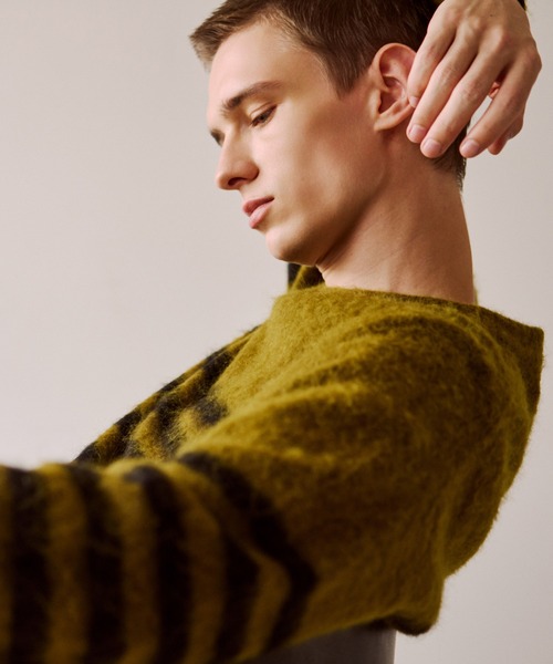 上品な毛足が季節感を引き立てる、大人のモヘアニット【素材】・ウール、ナイロン、ポリウレタンにモヘアをブレンドした4者混素材・モヘア特有の光沢とソフトさが生む、上品で奥行きある表情・バーズアイジャカード織りで軽やかさと柔らかなタッチを実現・縮絨による目の詰まった質感と、起毛加工による軽やかな着心地を両立・モヘア混による滑らかでチクチクしにくい肌触り・特殊な起毛加工により、編み地に空気を含み高い保温性を発揮【デザイン・シルエット】・フレンチトラッドの代表格「バスクシャツ」をモヘア素材でアレンジ・毛足の長いモヘアが、定番アイテムに新鮮な印象をプラス・リラックス感がありつつも大きすぎない、絶妙なシルエット・1枚着はもちろん、レザーやコートのインナーにも活躍【推奨サイズ】サイズM:身長~175cmサイズL:身長176cm~※標準体型を基にした目安になります。