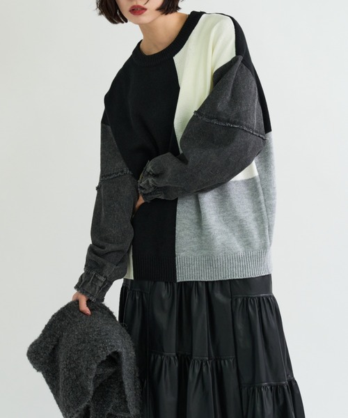 袖デニム切替 カラーブロッキング ニットプルオーバー【デニム切替スリーブを組み合わせたカラーブロッキングニット】■商品特徴カラーブロッキングデザインを採用した、ニットプルオーバー。袖部分にデニム素材を切り替えた異素材仕様が特徴です。■アイテム情報・カテゴリ:トップス / ニット / プルオーバー・性別:レディース・シーズン:秋冬・春・シルエット:標準・丈感:ヒップにかかる丈・厚み:普通・素材(本体):アクリル100%・素材(別布):綿100%・裏地:なし・伸縮性:あり(ニット部分)・透け感:なし・光沢感:なし・生地の硬さ:普通・ネック仕様:クルーネック・袖仕様:デニム切替・デザイン特徴:カラーブロッキング / 異素材切替■詳細説明本体にカラーブロッキングデザインを採用したニットプルオーバー。袖部分にはデニム素材を切り替えた異素材構成です。ニット部分は伸縮性があり、デニム切替部分は別布素材を使用。裏地なしの仕様で、トップスとして着用できます。ニット素材をベースに、袖のみデニムに切り替えている点が特徴です。■サイズ情報(cm)Mサイズ着丈:68身幅:60肩幅:53袖丈:51Lサイズ着丈:70身幅:62肩幅:55袖丈:52■スタイリングパンツやスカートなど、カジュアルスタイルを中心に幅広いボトムスと組み合わせ可能。トップスとして1枚で着用できます。■素材・混率本体:アクリル100%別布:綿100%■STAFF着用コメントニット素材をベースに、袖がデニム切替になっているデザインです。カラーブロッキングと異素材切替が特徴的です。(152cm・普通体型・Mサイズ着用)※着用感には個人差があります。■お気に入り登録★《お気に入り登録》でお得な情報がいっぱい★・商品のお気に入り登録で再入荷・セール情報をお知らせ・ブランドのお気に入り登録で新作・再入荷情報をチェックできます※商品画像は撮影時の光や角度により、実物の色味と異なる場合がございます※撮影はサンプル品を使用しており、表示のサイズ感も実物とは若干異なる場合もございます※生産時期により色・素材・サイズ感など多少異なる場合がございます※他のキャンペーンにより、期間中に価格が変動する場合があります※セールは予告なく終了させていただく場合もあります
