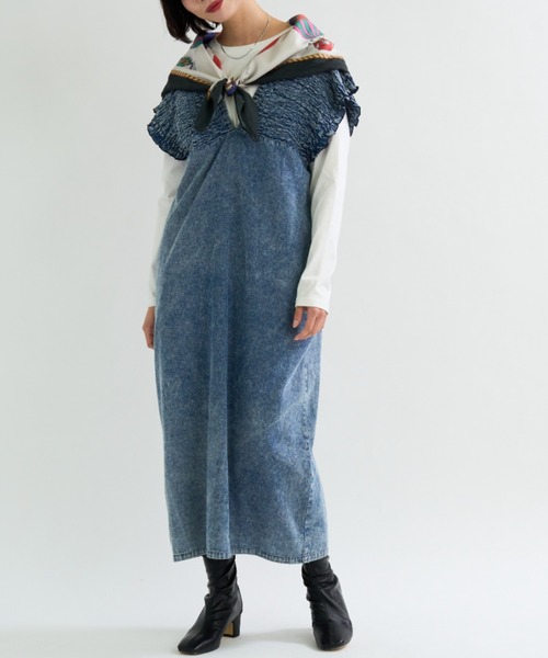 シャーリング切替 ミディ丈 デニムワンピース【胸元シャーリング仕様のデニムワンピース】■商品特徴胸元にシャーリング仕様を施した、ミディ丈デニムワンピース。シンプルなデニム素材に、シャーリングデザインを組み合わせた一着です。■アイテム情報・カテゴリ:ワンピース / デニムワンピース・性別:レディース・シーズン:通年・シルエット:ストレート・丈感:ミディ丈・厚み:普通・素材:綿100%・裏地:なし・伸縮性:なし・透け感:なし・光沢感:なし・生地の硬さ:普通・ポケット:あり(サイドポケット2)・デザイン特徴:胸元シャーリング仕様■詳細説明デニム素材を使用した、シャーリング切替デザインのワンピース。胸元部分にシャーリングを施し、身頃から裾にかけてはストレートシルエットに仕上げています。裏地なし・伸縮性なしの仕様で、インナーとのレイヤードにも対応。一枚着としても、重ね着としても着用可能なデニムワンピースです。■サイズ情報(cm)Mサイズ総丈:122身幅:50肩幅:47Lサイズ総丈:124身幅:52.5肩幅:48.5■スタイリング長袖Tシャツやニットなど、インナーとのレイヤードスタイルが可能。シューズはスニーカー、ローファー、ブーツなど幅広く合わせられます。■素材・混率綿100%■STAFF着用コメントシャーリング部分がデザインのポイントになっていて脚長効果も狙えます◎ミディ丈で、インナーとの重ね着もしやすく伸縮性もあるので体型カバーもできます◎(152cm・普通体型・Mサイズ着用)※着用感には個人差があります。■お気に入り登録★《お気に入り登録》でお得な情報がいっぱい★・商品のお気に入り登録で再入荷通知、セール通知を受け取ることができます・ブランドのお気に入り登録で新商品、再入荷情報を受け取ることができます※商品画像は撮影時の光や角度により、実物の色味と異なる場合がございます※撮影はサンプル品を使用しており、表示のサイズ感も実物とは若干異なる場合がございます※生産時期により色・素材・サイズ感など多少異なる場合がございます※他のキャンペーンにより、期間中に価格が変動する場合があります※セールは予告なく終了させていただく場合もあります