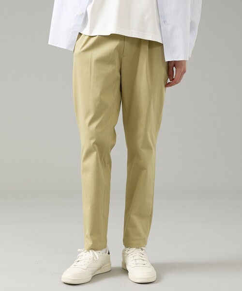 スマートなルック。そしてストレスゼロの着用感 「WONDER SHAPE(ワンダーシェイプ)」素材使用 タテ・ヨコ・ナナメと全方位に伸びる抜群のストレッチ 柔らかく、体の動きに合う着圧感シーズンレスな肉感で、あらゆるシーンで活躍する実用性の高い一本です。 【素材】 抜群のストレッチと脅威の伸長回復率を誇るワンダーシェイプを使用。 ただ伸びるだけでなく、張りこしのある素材で膝の抜けが軽減された形状安定性のある素材です。 【デザイン】 ビジネス~カジュアルと幅広い汎用性で人気の、定番テーパードシルエット。 1タックで腰回りにアクセントをつけながら、しっかりテーパードをかけたスリムなシルエットです。 ウエストはバックゴム+ドローコード仕様なので腰位置を調整しやすく、ストレスを感じない履き心地。 ドローコードは表裏と出し入れが可能で、ベルトも通せる仕様。 ベーシックなスラックスとしても使用可能です。 裾上げ不要のジャストレングス仕様です。 【コーディネート】 きれい目に幅広く合わせやすいテーパードシルエット。 ジャケット等と合わせたスマートスタイルはもちろん、休日のお出かけスタイルまで大人カジュアルに使いやすい1本です。