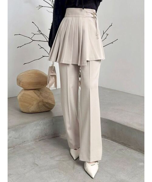 【商品】 プリーツスカートをレイヤードした、トレンド感のあるデザインが目を惹く、美シルエットパンツ。プリーツスカートは取り外し可能な2WAY仕様。ロングパンツのラインを美しく見せる計算されたシルエットと、伸縮性のある素材感で穿き心地も快適。 ヒップラインをカバーしながらトレンドライクなスタイリングに昇華します。 【スタイリング】 フィット感のあるトップスをINして、レイヤードデザインを主役にするのはもちろん、 ローゲージやヘアリーなニットをラフにアウトで合わせれば、甘さ控えめの大人カジュアルが完成します。 ※実際にお届けする商品と仕様やサイズが異なる場合がございます。 また生産の都合上、お届け時期が前後する場合がございます。 ※スカートの金具がゴールドからシルバーに変更となっております。 【 お買いものにおすすめの便利機能! 】 ★商品のお気に入り登録 完売カラーの再入荷時や、ラスト1点の時、セール開始時にお知らせします。 ★ブランドのお気に入り登録 新商品や再入荷、セール情報など、いち早くブランドのお得な情報を受け取ることができます。 ぜひご活用ください。