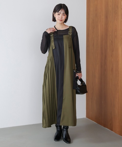 ■POINT 異素材切り替えが目を惹くサロペット風ワンピース。フロントの配色デザインと片側プリーツが、動くたびに表情豊かなスタイルを演出します。肩ベルトはバックル仕様で、カジュアルさとモード感をプラス。ゆったりとしたシルエットながら、縦のラインを強調する切替デザインでスタイルアップ効果も。Tシャツやシアートップス、ニットなどインナー次第でロングシーズン活躍するアイテムです。便利なポケット付きでデイリー使いにも◎。 ■FABRIC ハリ感とほどよいストレッチ性があり、デイリーにお召し頂けます。 ………………… 透け感:なし 裏地:なし ………………… ★商品のお気に入り登録 登録すると、完売しても再入荷時に通知を受け取ることができます。 ほかにもお得な特典があるかもしれません♪ ★ブランドのお気に入り登録 新商品や再入荷などの情報を受け取ることができますので、是非ご登録ください♪