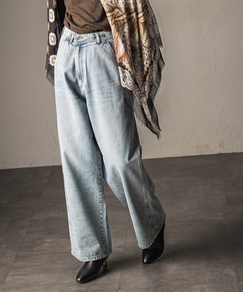 【デザインPOINT】「ワークテイストを、今っぽく」ウエストアレンジが楽しめる、進化系デニム・ペインターパンツ。グレイッシュなブルーカラーや、ヒップポケットのステッチ、細部まで拘りがつまった一本。腰に引っかかるぐらいのオーバーサイズ、今っぽさのあるワイドストレートシルエット。ウエストはファスナーを開けてクロスにしたり、手持ちのサスペンダーを付けてアレンジが楽しめます。【スタイリング】秋は、ブラウスやハイゲージニットと合わせてきれいめカジュアルなムードがおすすめ。デニムonデニムスタイリングも引き続きトレンド。【素材の特徴】【10.2oz 綿/セルロースデニム】ほどよい厚みで加工感が表現でき、なめらかな肌触りが魅力のセルロース混10.2オンスデニムを使用。シーズンレスで活躍します。----------------------------------------------------------------洗濯方法家庭洗濯:液温は40℃を限度とし、洗濯機で弱い洗濯ができる。自然乾燥:日陰の吊り干しがよい。アイロン:底面温度160℃を限度としてアイロン仕上げができる。ドライクリーニング:石油系溶剤による弱いドライクリーニングができる。----------------------------------------------------------------■モデル身長 166cm 170cm / 着用サイズ M※画像の商品はサンプルとなりますので実際の商品と仕様、加工、サイズが若干異なる場合がございます。※お客様のモニター環境により実際のお色と多少異なる場合がございます。※撮影状況や光の当たり具合により、色合いが異なって見える場合がございます。----------------------------------▼商品のお気に入り登録ハートマークをクリックし、お好きなカラーを選んでお気に入りに登録完売カラーの再入荷通知や、ラスト1点の通知、セールの通知も受け取ることができます。▼ブランドのお気に入り登録新商品や再入荷等、いち早くブランドのお得な情報を受け取ることができます。----------------------------------