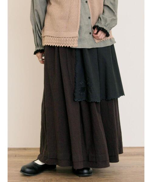 ナチュラルで可愛らしい印象を与える刺しゅうクロス付きのスカート。裾に向かってふんわりと広がるシルエットになっており、スタイリングに立体感を演出します。ゴム仕様のウエストがラクな穿き心地を実現。季節の変わり目のお出かけスタイルに重宝したいアイテムです。 ※商品画像は、撮影環境やお客様のご利用のPC・スマートフォンのモニター環境などにより実物と色味に差異がある場合がございます。【その他採寸】F ウエスト:[ゴム仕様]68cm
