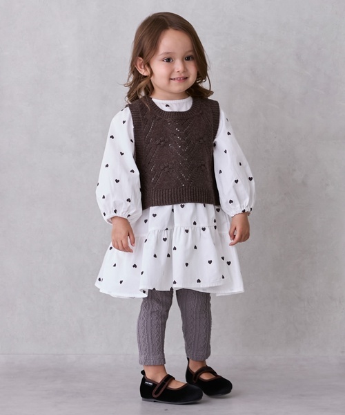 透かし編みのベストがセットになっているティアードワンピースです。 女の子らしいハート柄と上品な花柄の2パターン展開。 サイドにあしらった飾りリボンがアクセントになっています。 一枚で魅力的なコーディネートが完成するアイテムです。 内側にお名前を記入できるタグつき。 9654504:【リンク】ベストつきOPセットアップでベビーサイズ、3353301:【リンク】ベストつきティアードワンピースで大人サイズのお揃い着用ができます。 【透け感】透けない 【生地の厚さ】普通 【伸縮性】あり 【裏地】なし 【ポケット】なし 【アジャスター】なし