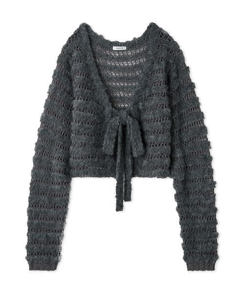 【タイプの違う糸をボーダーに編んだ、羽織るだけでサマになるカーデ】【Design/Styling】ふわりとした毛足の部分と、透け感のあるネット編みの部分がボーダー状になった、個性的な編み地のカーディガン。タイプの違う異素材をMIXさせたテクスチャーが、美しく調和しています。ふわふわの部分は、毛を掻いて柔らかく起毛させた糸、透けた部分はシャリ感のある糸でコントラストをつけて、表情豊かに。シルエットはルーズなデザインに仕上げていて、さらっと羽織るだけでスタイルに奥行きを加えてくれます。共糸で仕立てた、ふわふわのリボンディテールもさりげないアクセントに。カジュアルな中にもエレガンスが漂う、トレンドライクな主役カーディガンです。カラーは3色をご用意。優しい印象のOWHT、モード感がアップするGRY、差し色になるTUQで展開しています。※照明の関係により、実際よりも色味が違って見える場合があります。またパソコン・スマートフォンなどの環境により、若干製品と画像のカラーが異なる場合もございます。予めご了承ください。商品の色味は、商品単品画像をご参照下さい。※商品画像はサンプルのため、色味やサイズ等の仕様に変更がある場合がございますので、予めご了承ください。