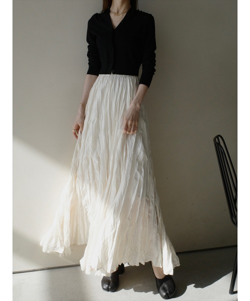 ・【新ページで再販中】▶品番:8226-20701で検索【デザイン&ディテールポイント】ワッシャー加工が施された、存在感抜群のロングスカート。お手入れも楽で長持ちするワッシャー加工は、長年愛用していただけるアイテム。程よいボリューム感で、動くたびフレアが目を惹きエレガントな印象に。ウエストゴムなので長さ調節もでき、ストレスフリーな履き心地です。安心の裏地付きで透け感も気にせず、ロングシーズンでお使いいただけます。【コーディネートポイント】クロップド丈のトップス合わせでスタイルアップ。ベーシックトップスと合わせて、主役スカートとしても活躍。アイボリー、ブラックの2色展開。
