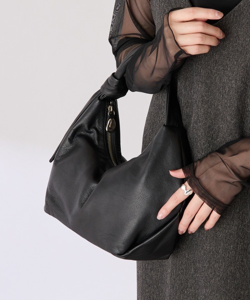 COLLAGE GALLARDAGALANTE×gemeil コラボアイテム】ノットワンハンドルバッグ(CE-1356)gemeilの人気アイテムに”COLLAGE GALLARDAGALANTE”コラボ限定カラーが登場!-COLLAGE GALLARDAGALANTEコラボ限定カラー-【Black2】のカラーが コラボ限定カラーです。gemeilのバッグはほとんどがゴールド金具を使用していますが、限定カラーではシルバーの金具を採用。通常のラインナップとは一味違ったデザインや雰囲気をお楽しみいただけます。-デザイン-持ち手の結び目(knot)が特徴的なデザイン。荷物がたくさん入った時はふっくらとした印象、少ない時はバッグの真ん中がくたっと落ちるトレンド感のあるフォルムに。荷物量によってシルエットの変化を楽しむことができるアイテムです。手持ちと肩掛けで使用できる2WAYタイプ。結び目の位置を変えてお好きな長さに調節が可能です(最長40cm)。マチ幅が広いため小さいサイズながら収納力が高い点も魅力。ファスナーの引き手部分にはアイコンのニュアンスパーツが付いております。≪収納の目安≫・折財布・パスケース・500mlペットボトル・折り畳み傘・ハンドタオル・イヤホン<仕様>・内装ポケット:オープンポケット×1【注意事項】・本革を使用した製品のためシワ感のある部分や、キズがある部分と、生活によって生まれたその個体ならではの個性がございます。・革個性や革の表情はお選びいただく事ができません。予め天然素材であることをご了承の上お買い求め頂くようお願いいたします。・また水濡れや摩擦により色落ちや洋服への色移りが発生する可能性がございます。・金具部分に関して、保管環境や使用状況により変色などが起こる場合がございます。≪返品・交換について≫・着用後、洗濯後の返品・交換は致しかねます。・商品到着後、着用前に商品状態のご確認をお願い致します。・ECサイトでご購入いただいた商品は、お修理を承っておりません。【気になる商品は「お気に入り」登録を】ハートマークをクリックし、お好きなカラーを選んでお気に入りに登録すると入荷情報や残り1点の通知、完売カラーの再入荷、セール情報などを受け取ることができます。※撮影場所やお使いのモニター環境により若干お色味が異なる場合がございます。特にロケの撮影では明るく見える傾向にございます。詳細撮影画像で色味をお確かめくださいます様お願いいたします。※サンプルで撮影をしております。若干の仕様が変更になる場合がございますので予めご了承の上ご注文くださいますようお願いいたします。※サンプルでの採寸のためあくまで目安となります。予めご了承ください。【PAPILLONNER/パピヨネ】