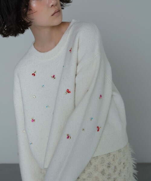 ふんわりした編地とビジューが存在感たっぷりなニット ■デザイン 前身頃にちりばめたビジューとふんわりとした風合いの編地がポイントのニットプルオーバー。 コンパクトなシルエットで様々なボトムと相性よく合わせていただけます。 配置にもこだわったカラフルなビジューが存在感を発揮してくれる1枚です。 ■素材 少しかさっとした風合いもありながら、縮絨された編地に仕上げる事で、ほどよくカジュアルな印象をプラスしています。 ■コーディネート ミニボトムにブーツ合わせがキャッチーでおすすめ。 デニムでラフな着こなしから、ナロースカート合わせで少しモードに仕上げても◎です。 #秋服,#秋物,#冬服,#冬物,#25FW,#25AW,#ニット,#セーター,#ビジュー,#ストーン ============================ 裏地:なし 透け感:なし 光沢感:なし ケア方法:手洗い可 ============================ < EMMEL REFINES(エメル リファインズ) > Pleasure ~今を楽しみ、変化を楽しむ~ EMMEL REFINESは変化していく時代やトレンドを恐れなく前向きに楽しみ、 今に満足せず常に自分を更新していきたい、 自分らしさを表現したい女性に向けたブランドです。 女性の共感を大切に、時代にフィットした新しいスタイルを提案します。 【注意事項】 ※画像の商品はサンプルです。 ※商品に「取り扱い上の注意書き」、「洗濯表示」がございます場合は、使用前に必ずご確認ください。 ※商品画像は、光の当たり具合やパソコンなどの閲覧環境により、実際の色味と異なって見える場合がございます。あらかじめご了承ください。 ※商品の色味の目安は、商品単体の画像をご参照ください。 お問い合わせの際は、ユナイテッドアローズ カスタマーサービスデスクまで下記の品名/品番をお申し付けください。 品名:EM HW FLUFFY ビジュー PO 品番:66131000008