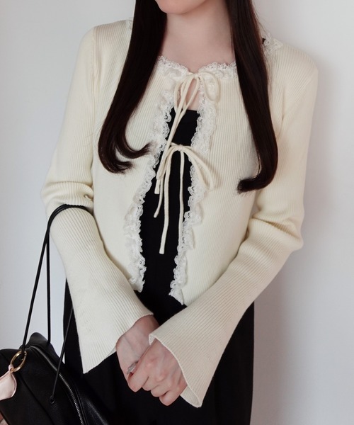 【JUNOAH / ジュノア】愛らしいレースフリルがポイントのニットカーディガン。■detailふわふわのフリルレースがフェミニンなアクセントになり、フロントのリボンでさらに華やかさをプラスするカーディガン。リブ編み素材でほどよく身体にフィットし、女性らしいシルエットを演出します。また、コンパクトな丈感でスタイルアップが叶い、ゆるやかに広がるフレアスリーブで手元まで華奢見えする一枚です。■fabric滑らかで、しなやかな伸縮性が魅力のニット素材。…………………透け感:アイボリーのみややあり厚さ:普通伸縮性:あり裏地:なしシワ:なりにくい推奨シーズン:9月~10月、3月~4月※アウターやインナーによって長いシーズン着用いただけます。※関東の平均気温を目安に推奨シーズンを記載しております。…………………※詳しいお手入れ方法は商品タグをご参照ください。【※必ずご確認の上、ご検討ください※】・通販の特性上、到着時には畳みシワが必ずございますのでご了承ください。・掲載している画像はできる限り実際の商品に近づけておりますが、モニター環境や照明等により、実際の色味と異なる場合がございます。・商品画像は撮影時の光や角度により、実物の色味と異なって見える場合がございます。・撮影はサンプル品を使用しており、表示のサイズ感も実物とは若干異なる場合がございますので、予めご了承ください。・生産時期により色・素材・サイズ感など多少異なる場合がございます。予めご了承ください。・濃色製品は、摩擦(特に湿った状態での摩擦)や、汗・雨などで濡れた際に他の衣料やバッグなどに色移りする場合がございます。淡色・白物との組み合わせや重ね着の際はご注意ください。・洗濯の際は、他の衣類と分けて単独で洗ってください。淡色・白物と一緒に洗うと色移りする恐れがあります。・洗濯の際はネット使用をおすすめいたします。漂白剤のご使用はお避けください。・タンブラー乾燥(乾燥機の使用)は、生地の縮みや型崩れ、風合いの変化の原因となるためお避けください。・素材の特性上、洗濯や着用により多少の縮み・ゆがみが生じる場合がございます。・天然素材(綿・麻・ウールなど)を使用している商品は、繊維の特性上ネップ(糸の節)や多少の織りムラが見られる場合がございますが、素材の風合いとしてお楽しみください。・ダメージ加工やウォッシュ加工が施されている商品は、1点ごとに風合いや色の出方が異なります。製品の特性としてご理解ください。・商品生地の特性により±1-2cm(ニット製品は±1-3cm)程度の誤差が生じる場合がございます。・着用感には個人差がございます。サイズ表記は目安としてご参考ください。・プリント・刺繍・装飾のある商品は、摩擦や洗濯により多少のはがれ・毛羽立ちが生じる場合がございます。お取り扱いにはご注意ください。・直射日光や蛍光灯の光に長時間当たると、変色・退色する場合がございます。保管の際は光の当たらない場所で保管してください。※返品・交換規定は当サイトのヘルプをご参照ください。★お買いものをよりお楽しみいただく為に!★▼商品のお気に入り登録お気に入りアイテムの完売カラーの再入荷通知や、ラスト1点の通知、セールの通知も受け取ることができます。▼ブランドのお気に入り登録新商品や再入荷など、クーポン配布などのお得な情報を受け取ることができます。