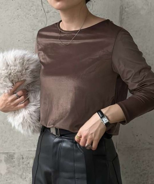 上品な光沢感【デザイン】程よい光沢感でコーデに華やかさをプラスできる、大人レディーなデザイン。着回し力抜群のベーシックなラウンドネック。すっきりめの幅と腰にかかる丈感。【素材・機能】シーズンライクな着こなしが楽しめる、ストレッチの利いた、柔らかなベロア素材。【スタイル】1枚でも、カーディガンやシャツとのレイヤードやキャミワンピースなどのインナーとしても、幅広く活躍。品番:579-11-9695