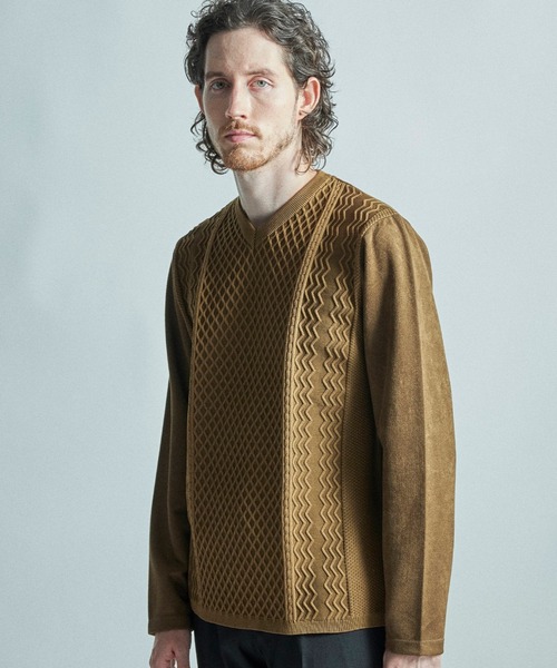 【ニットの見た目とカットソーの快適さ。異素材コンビ長袖Tシャツ】 ポリエステルで編んだアラン風ニット素材と、フェイクスエードカットソー素材を組み合わせた、ニットコンビ長袖Tシャツ。 立体感のある編地が美しいニットを前身頃に、同色系のフェイクスエードカットソー素材を袖と後ろ身頃に使用することで、ニットのきれいめな見た目とカットソーの快適性をドッキングした、大人のための上品なトップスです。 【デザイン/素材】 クラシカルな印象のアラン調ニットは、2色の微妙に異なるカラーの糸で編み上げることで、奥行きと立体感のある表情を出しました。 カットソー部分にはなめらかで肌触りが良く、厚みとふくらみが高級感あふれるフェイクスエードダンボールカットソーを使用。 袖と後ろ身頃をカットソーにすることで、ジャケットの中でもたつきにくく、大人っぽく上品な印象にまとまっています。 全体ではなく前身ごろのみニット素材を使うことで、きちんとした見た目とカットソーの快適な着心地を兼ね備え、デイリーユースはもちろん、ビジネスカジュアルやお出かけなど、幅広いシーンに対応します。 【シルエット】 適度なゆとりを持たせつつ、オーバーサイズまでは行かないリラックスフィットシルエット。カジュアルすぎない、きちんと感のある印象です。 【ディテール】 Vネックデザインで顔周りと首元をすっきりシャープに見せ、きれいめにも着こなせる万能Tシャツ。 一枚でも、ジャケットやシャツのインナーとしても映える一枚です。 モデル:身長:185cm バスト:90cm ウエスト:77cm ヒップ:92cm 着用サイズ:03(L) ※照明・光の加減、PCやスマートフォンなどの環境により、製品と画像のカラーの見え方が異なる場合がございます。 ※画像はサンプルのため、色味やサイズ等の仕様が変更になる場合がございます。 ※サイズは弊社規定の採寸によって記載しておりますが、若干の個体差が生じる場合がございます。