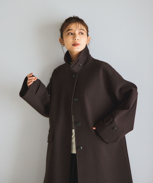 後ろ姿もお洒落な一着様々な着こなしが楽しめるステンカラーコートーーー【素材】薄手のウーリーテック素材(ウールライクニットの軽い素材)を使用。暖かく肌触りが良いのも特徴です。【デザイン】着こなしの幅が広がるマルチWAY仕様のステンカラーコート。きちんと感の出るステンカラーでの着用はもちろん、襟を立ててスロートラッチというタブを留めることでスタンドカラーとしてもご着用いただけます。着丈は膝丈くらいなので足回りもしっかりと守られ、寒い時期も暖さ◎後ろにはフェイクのタブが付いたプリーツ仕様になっており、後ろ姿もお洒落な一着です。アウター コート ステンカラー ーーー【スタイリング】パンツスタイルと好相性◎デニム合わせの大人カジュアルな着こなしや、綺麗めパンツと合わせたレディライクな着こなしもおすすめです。