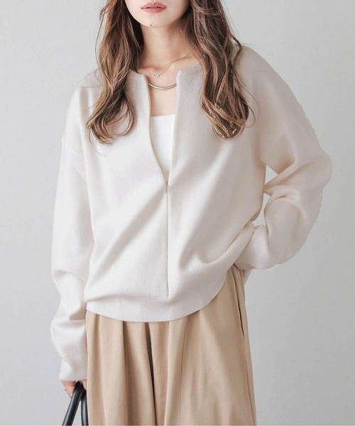 長めのジップデザインで抜け感自在◎ゆるっとこなれ見せニット裾のリブ部分の上までジップを施した、お好みの抜け感を演出できるニットトップス。ゆるっとしたシルエットで体型カバーも叶い、シャツやロンTとのレイヤードでシンプルながらこなれたコーデに◎カジュアルながら上品見えする万能トップスです。Point 01抜け感生み出すジップデザイン裾リブの上までジップをあしらい、自分好みの抜け感を演出できるデザイン。ジップを全て閉めると、シンプルなクルーネックトップスとしてもご着用いただけます。Point 02レイヤード次第で自在な着こなし◎一枚で着こなすのはもちろん、ロンTや襟付きシャツとレイヤードさせたトレンドライクなコーデもおすすめ◎ボトムスを選ばず、デイリーに着回しできるアイテムです。【25AW】■Fabric柔らかく、もっちりとした弾力感のあるニット生地チクチク感の無いふんわりとした素材感---------------------透け感:オフホワイトのみ若干あり裏地:なし厚さ:普通伸縮性:あり---------------------▼《お気に入り登録》でお得な情報がいっぱい▼・「商品のお気に入り登録」で再入荷通知や、ラストの通知、セール通知も受け取ることができます。・「ブランドのお気に入り登録」で新商品や再入荷など、お得な情報を受け取ることができます!
