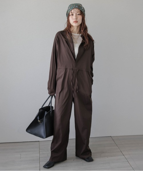 マニッシュなデザインながらも女性らしい大人のまとまり感どこか品のある、洗練されたシンプルなデザインのオールインワン。秋冬シーズンにお使いいただける長袖タイプが新しく登場!オーバー過ぎない程よいゆるっと感が女性らしさを演出し、調節可能なウエスト紐でメリハリのあるシルエットに。シンプルなアイテムなので、小物次第で様々なコーデが楽しめます。Point 01オーバー過ぎない 程よいゆるっと感程よくゆったりしたシルエットがこなれた印象のアイテム。体のラインを拾わず、体型カバーしつつラフな着心地を叶えてくれます。Point 02メリハリのあるウエストデザイン調節可能なウエストデザインで、メンズライクな印象ながらも女性らしさをプラスし、メリハリのあるシルエットに。楽ちんな着心地ながらも、1枚でキマるアイテムです。【25AW】■Fabricつるっとした滑らかな肌触りの生地感繊細なシボ加工を施した、表情のある素材感です。---------------------透け感:淡色若干あり裏地:なし厚さ:薄手伸縮性:あり---------------------▼《お気に入り登録》でお得な情報がいっぱい▼・「商品のお気に入り登録」で再入荷通知や、ラストの通知、セール通知も受け取ることができます。・「ブランドのお気に入り登録」で新商品や再入荷など、お得な情報を受け取ることができます!