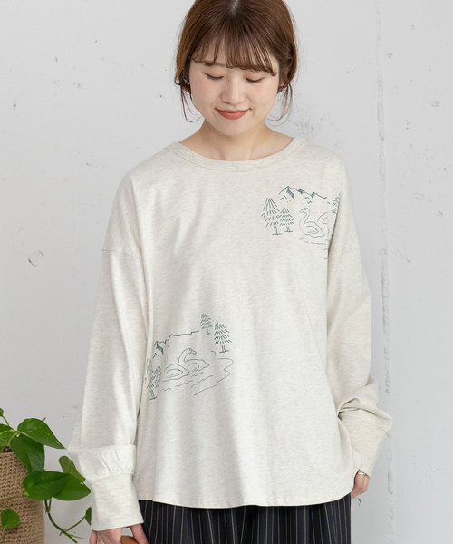 ■Point白鳥が湖に浮かぶ湖畔の風景のイラストをプリントした長袖Tシャツ。手描きのゆるっとした雰囲気とオーバーサイズシルエットで、リラックス感のあるアイテム。1枚着としてはもちろん、シャツやスウェットのインナーにも使えます。レッドは差し色にもなるのでおすすめです。--------------------透け感:なし厚さ:普通伸縮性:ややあり--------------------◆注意事項◆可能な限り実物に近いカラーにて掲載しておりますが、ご使用のパソコンやスマートフォンなどの端末の環境によって、実際の色味と異なって見える場合がございます。予めご了承ください。サンプルで撮影している商品もございます。その場合、実際の商品とは色味・仕様が異なる場合がございますので、予めご了承ください。POU DOU DOU プードゥドゥひと手間加えた存在感のある「日常着」いつまでもときめきとかわいいを忘れない方への愛着を持てるワードローブ= お気に入り登録がおすすめ!=お得な情報をいち早くお届け致します。アイテムをお気に入り⇒ SALE START / 完売COLOR再入荷 / LAST1点 etc...ブランドをお気に入り⇒新商品 / 再入荷 /クーポン・セール情報 etc...