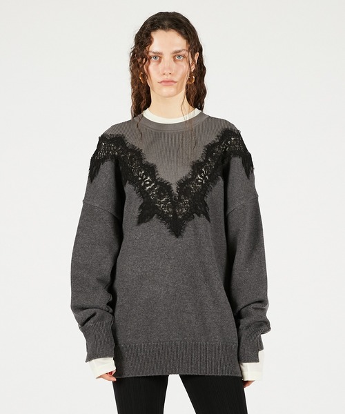 ー Style ーレースラインがエレガントな印象で存在感のあるニットトップス。レース部分が透けて女性らしさがありつつ、オーバーサイズでエッジの効いた一着。カジュアルなボトムスに合わせても女性らしさがあり、スーチング系アイテムと合わせるとこなれ感のある印象に仕上げてくれるおすすめアイテム。 ー Fabric ーネック上部は繊細な細番手糸を使用。下部はふんわりとした上品な風合いのカシミア混の糸を使用することで、素材のコントラストを楽しめるニット。カラーにより配色の雰囲気が異なる点もポイント。【PRANK PROJECT/プランクプロジェクト】常識に縛られない洗練された大人の女性に向けて”意外性” と ”品の良さ” をMIXさせた上質なNEW MODE BRAND・商品のお気に入り登録再入荷、残り1点などの通知を受け取ることが出来ます。・ブランドのお気に入り登録新商品や再入荷、ショップのおすすめトピックスなど、いち早くブランドのお得な情報を受け取ることができます。