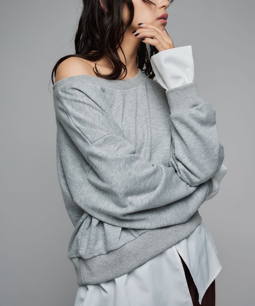 シャツオフショルスウェット【ポイント】 まるでスウェットとシャツを掛け合わせたようなドッキングデザインが魅力のトップス。異素材のコンビネーションがモードな印象を引き立て、コーディネートに新鮮なアクセントをプラスします。【デザイン・シルエット】 ドッキングされたシャツは袖口と裾部分のみに施されているため、余計なボリュームが出ず、すっきりとしたシルエットで着こなせます。広めに開いたネックラインは、そのまま着用するだけでなく、ワンショルダーやオフショルとしても楽しめ、シーンに合わせて印象を自在に変えられるデザイン。シャツ部分はやや長めの丈感で抜け感を演出しつつ、スウェットはウエスト位置に設定されているため、バランスよくスタイルアップを叶える一枚です。【おすすめのスタイリング】 落ち着いたカラーを採用しているため、どんなボトムスとも好相性なトップス。デニムと合わせてカジュアルスタイルや、チュールスカートやスラックスと合わせてきれいめスタイル、ミニボトムスと合わせてフェミニンスタイルにもマッチする万能アイテムです。【素材】なめらかで肌触りが良くしわになりにくいイージーケア性と、やわらかくさらっとした快適な着心地の素材。上品な質感が、日常使いから特別な日まで幅広く活躍します。※ご覧のモニター環境や撮影環境により実の商品と多少色味が異なって見える場合がございます、ご理解の程を宜しくお願い致します。▼商品のお気に入り登録をおススメ致します☆サイズやカラー横のハートマークをクリック!完売カラーの再入荷や、ラスト1点の通知、セールの際の通知を受ける事ができます。お気に入り登録も宜しくお願い致します♪