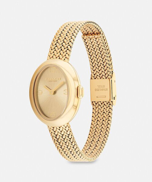 サミー ウォッチ・22MM 都会的なミニマリズムの感性でデザインされたサミー。 ゴールドトーンのケースにヴィンテージ風のメッシュ ブレスレットを合わせた、普段使いに最適な洗練された腕時計です。サンレイ文字盤に数字マーカーがアクセントを添えます。 ・ゴールド トーン ケース、テクスチャード メッシュ ブレスレット ・ケース サイズ:約22mm ・ミネラル クリスタル ・クオーツ ・フォルドオーバー クラスプ開閉 ・3気圧日常生活用防水 ・レディースサイズ ※ご使用のパソコンやスマートフォンの画面設定や機種により実際のカラーと異なって見える場合がございます。 ※カラー名は管理用の表記であり、タグの表記と異なっております。 【COACHについて】1941年にニューヨークで創立したグローバルファッションブランドです。美しさと機能性を兼ね備えたコーチ製品には、熟練したクラフトマンシップが細部にまでに行き届き、最高の使い心地とスタイルをお届けします。コーチが誇るクラシック スタイルと優れたクオリティは、ニューヨーク マンハッタンのロフトで、80年以上も前、最初のコーチの革製品が作られた時に確立されたものです。1941年の創業から長い年月を経ても揺るがないコーチの本質。品質、耐久性、機能性、スタイルと言う四本柱がブランドをしっかりと支え、ジェンダーレスに使えるデザインも豊富にあり、ギフトにもおすすめです。クリエイティブ・ディレクターのスチュアート・ヴィヴァースのビジョンと、私たちのホームタウンであるニューヨークの、誰をも受け入れる姿勢(インクルーシブ)、そして勇気ある精神にインスパイアされ、誰もが自分らしくいられるように、永く愛される美しいものづくりを行います。