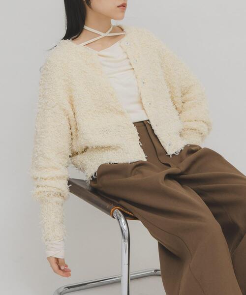 【チュールフリンジが華やかさを演出してくれるカーディガン】チュールが組み込まれた、表面感のあるファンシーヤーンがキャッチーなカーディガン。ドライタッチな編地にすることで、室内でも快適に過ごせるよう仕上げました。程よいコンパクトな着丈や、袖がたまるようなシルエットもポイント。隠しドット釦を付けているので、プルオーバーとしても着回せます。【2025 Autumn/Winter】【25AW】総重量 : 約640g※商品画像は、光の当たり具合やパソコンなどの閲覧環境により、実際の色味と異なって見える場合がございます。予めご了承ください。※商品の色味の目安は、商品単体の画像をご参照ください。▼お気に入り登録のおすすめ▼お気に入り登録された商品は、マイページにて現在の価格情報や在庫状況の確認が可能です。お買い物リストの管理にぜひご利用ください。素材感透け感 : なし伸縮性 : あり裏地 : なし光沢 : なしポケット : なしone
