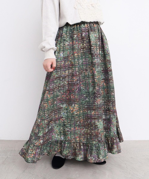 チェック柄と小さなお花を水彩絵の具でいくつか描き隙間から花がのぞくように、パッチワークするように、組み合わせて柄を作りました。早い時期から楽しめる秋の手描きチェック。裾に切り替えを入れ、かろやかで動きのある新鮮な形のスカート。キュプラ混の生地はほんのりとした光沢があり、冬にかけて裏毛やニットなどのあったかいアイテムとの相性も◎トップス次第でロングシーズン◎※着用商品はサンプルです。実際の商品と仕様、加工、サイズが若干異なる場合がございます。※光の関係で実物の商品の色味とは若干異なる場合がございます。実際に近い色味は詳細画像をご参照下さい。※取り扱いの注意については取り扱い表示をよくご確認の上、着用をお願いいたします。【素材の特性、お取り扱いの注意】・この製品は、インクジェットプリントを施しております。汗や雨等でぬれた時や強くこすられた場合に色落ちし、他の衣料、小物に移染する事があります。白及び淡色の衣類、バッグ等をご使用されますと、色移りする事がありますのでご注意下さい。洗濯の際は他の物に色がつく場合がありますので単独で洗って下さい。・キュプラは水にぬれると縮みやすく、強度が下がることがあります。また、摩擦によって表面が毛羽立ちやすいので、お取り扱いには十分ご注意ください。・独特の風合いを出すため製品洗いをしてます。一枚一枚の色味、風合い、サイズ等も微妙に違います。素材の特性上、しわが出来やすいのですが、他の製品では味わえない雰囲気をお楽しみください。・この製品を洗濯する際には多少縮む場合がありますので、形を整えてから日陰で干して下さい。l'atelier du savon(アトリエドゥサボン) CONCEPT 1つ1つにかけられた手のぬくもり日々の生活に、少しのデザインを加えた大人の日常着あそび心とあたたかみ