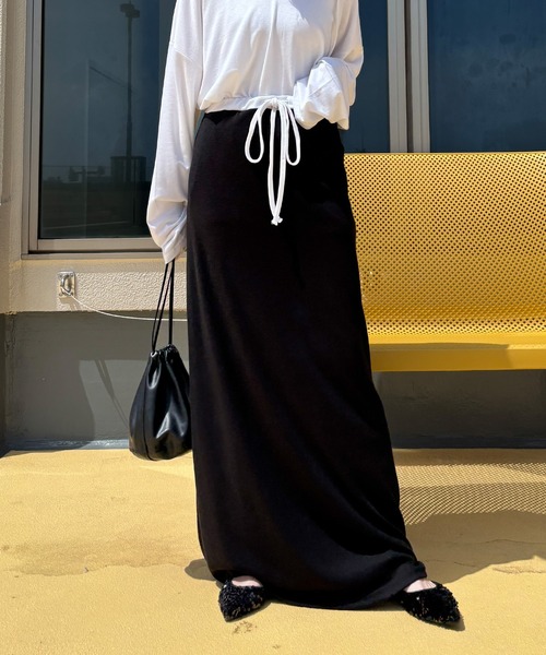 【ISOOK / アイスー】ダブルウエストルーズスカート / マキシスカート フルレングス ロング丈 ルーズ ストレート ウエスト紐 リボン 配色 ウエスト切り替え グレー ブラック 黒 無地 ZOZOTOWN限定