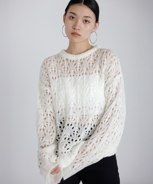 ざっくり感が心地良い、モヘアタッチの透かし柄ニット繊細な透かし柄が存在感を放つ、クラフト感のあるニット。ざっくりと編み立てた程よいシアーが抜け感を演出します。アクリル×モヘアのふんわりとした肌触りが魅力。立体感のある表情で、一枚でスタイリングに奥行きをプラスします。ドロップショルダーのゆったりとしたシルエットで今っぽく。------------------------透け感/あり光沢感/なし伸縮性/あり裏地/なし厚み/普通------------------------※着用中の摩擦や、汗、水濡れにご注意ください。濃色品は、色落ちや他のものへ色移りすることがあります。※摩擦により毛羽立ち、毛玉が生じますので、着用後はブラシなどで表面を整えてください。※デリケートな素材を使用していますので、引っ掛かり、摩擦にご注意ください。【必ずご確認の上、ご検討ください】※商品画像は撮影時の光や角度、お使いの照明やモニター環境により実物の色味と異なって見える場合がございます。※サイト上のカラー・サイズ表記と商品タグのカラー名・サイズ名が異なる場合がございます。※着用、お取り扱いの際は商品についておりますアテンションタグ、洗濯ネームを必ずご確認ください。※生産時期により、色・素材・サイズ感など多少異なる場合がございます。※商品によっては、繊維や染料のにおいが感じられる場合がございます。数日のご使用や陰干しなどで匂いはほとんど感じられなくなりますのでお試しください。※通販の特性上、到着時には畳みシワがついている場合がございます。【Information】◆《お気に入り登録》がオススメ◆・「商品のお気に入り登録」で再入荷通知や、ラストの通知、セール通知も受け取ることが出来ます。・「ブランドのお気に入り登録」で新商品や再入荷など、お得な情報を受け取ることが出来ます。