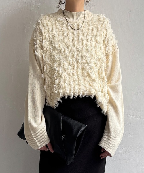 ランダムに入ったフリンジでリズム感を出したニットプルオーバー。デイリーにもお出かけにも使いやすく、1枚で存在感のあるスタイルが完成します。【素材】ランダムフリンジニット。【デザイン】クルーネックのデザイン。【ポイント】トレンドのフリンジ使いのニットで、ランダムに入っているのがカジュアル感があり可愛いポイント。着ぶくれして見えないよう、袖はシンプルにリブ使いで締めています。